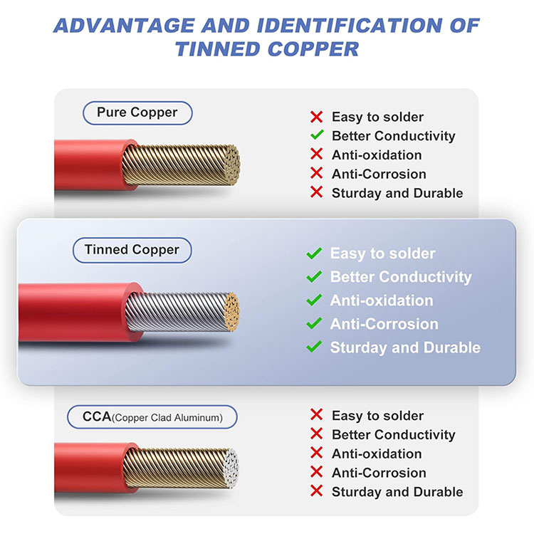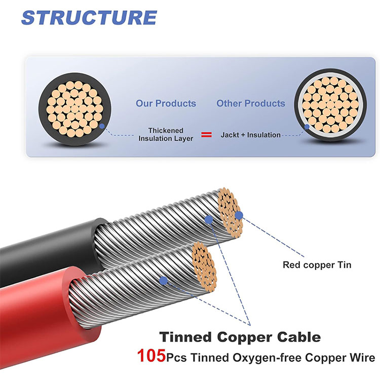 105 ٹینڈ ریڈ کاپر: 10AWG سولر ایکسٹینشن کیبل 105 ٹن شدہ سرخ تانبے سے بنی ہے، جس میں خالص تانبے سے بہتر چالکتا، تھرمل چالکتا، اور سنکنرن مزاحمت ہے اور استعمال کے دوران بجلی کے نقصان کو کم کر سکتی ہے۔