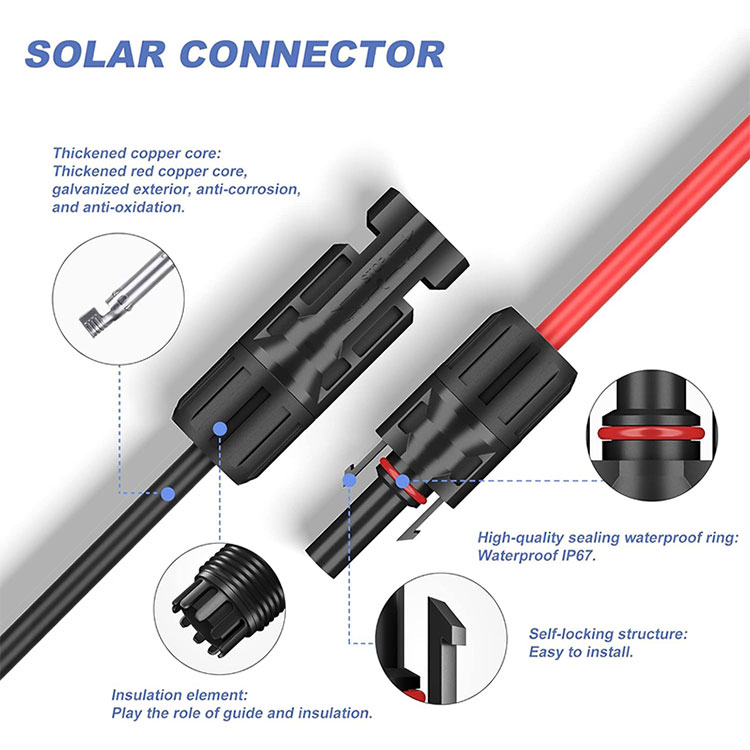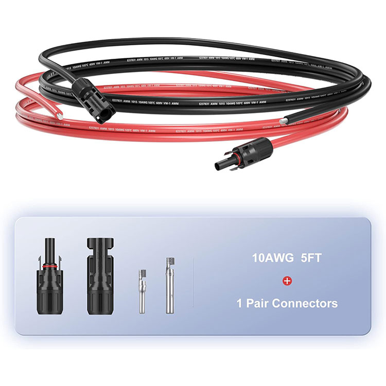 آپ ہماری فیکٹری سے 5 فٹ 10AWG(6mm2) سولر پینل وائر خریدنے کی یقین دہانی کر سکتے ہیں۔ 10AWG سولر کیبل کنیکٹر کٹ: 5Ft سیاہ اور 5Ft ریڈ سولر پینل کیبل تاریں کنیکٹرز کے جوڑے کے ساتھ۔ ایک سرے پر کنیکٹر ہوتا ہے، اور دوسرا ننگا تار ہوتا ہے۔ یہ کسٹمر پر منحصر ہے کہ آیا کنیکٹر کی ضرورت ہے۔